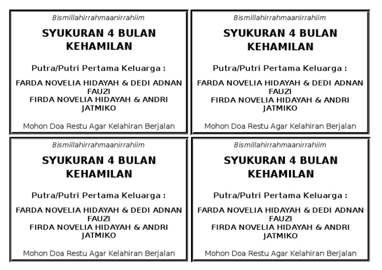 Download Undangan Walimatul Hamli 4 Bulan Versi 1 Arie Cellular from 1.bp.blogspot.com Tak terasa, kini paula telah memasuki usia kehamilan yang keempat bulan. Syukuran kelahiran bayi4.doc, uploaded : Anda tinggal edit atau ubah sendiri bagian bagian yang perlu di ganti. Download lagu dan video terbaru. Showing posts with label undangan. Ben 18.4 syukuran 4 bulan. Download undangan syukuran 4 bulanan download document. Sudah punya stiker tasyakurannya belum ?